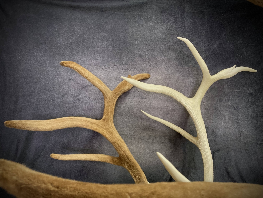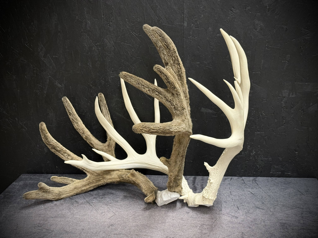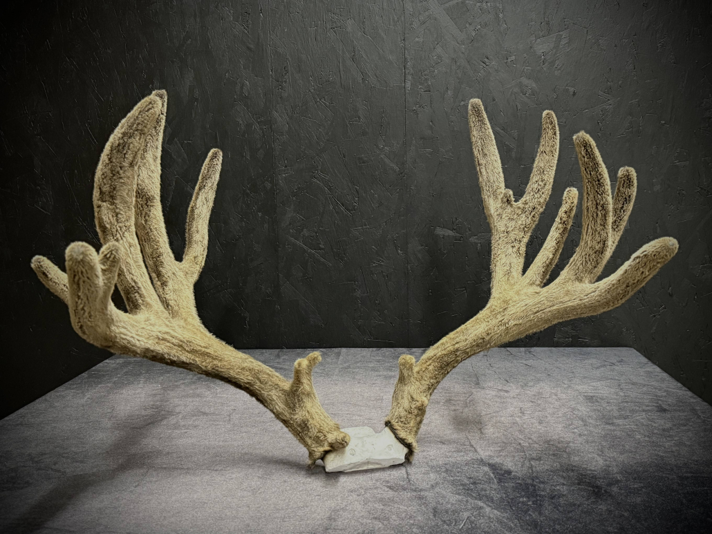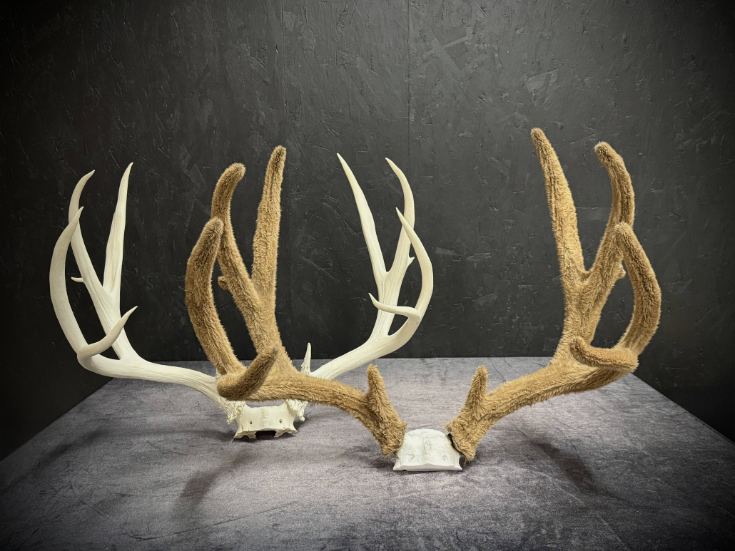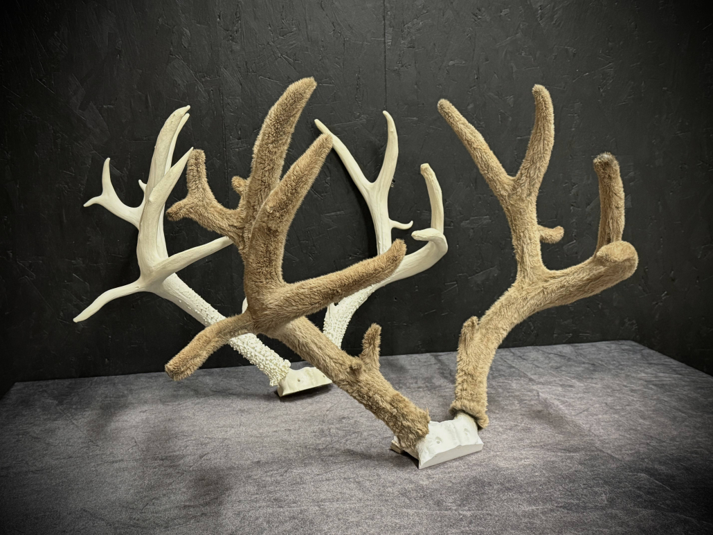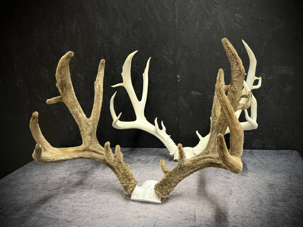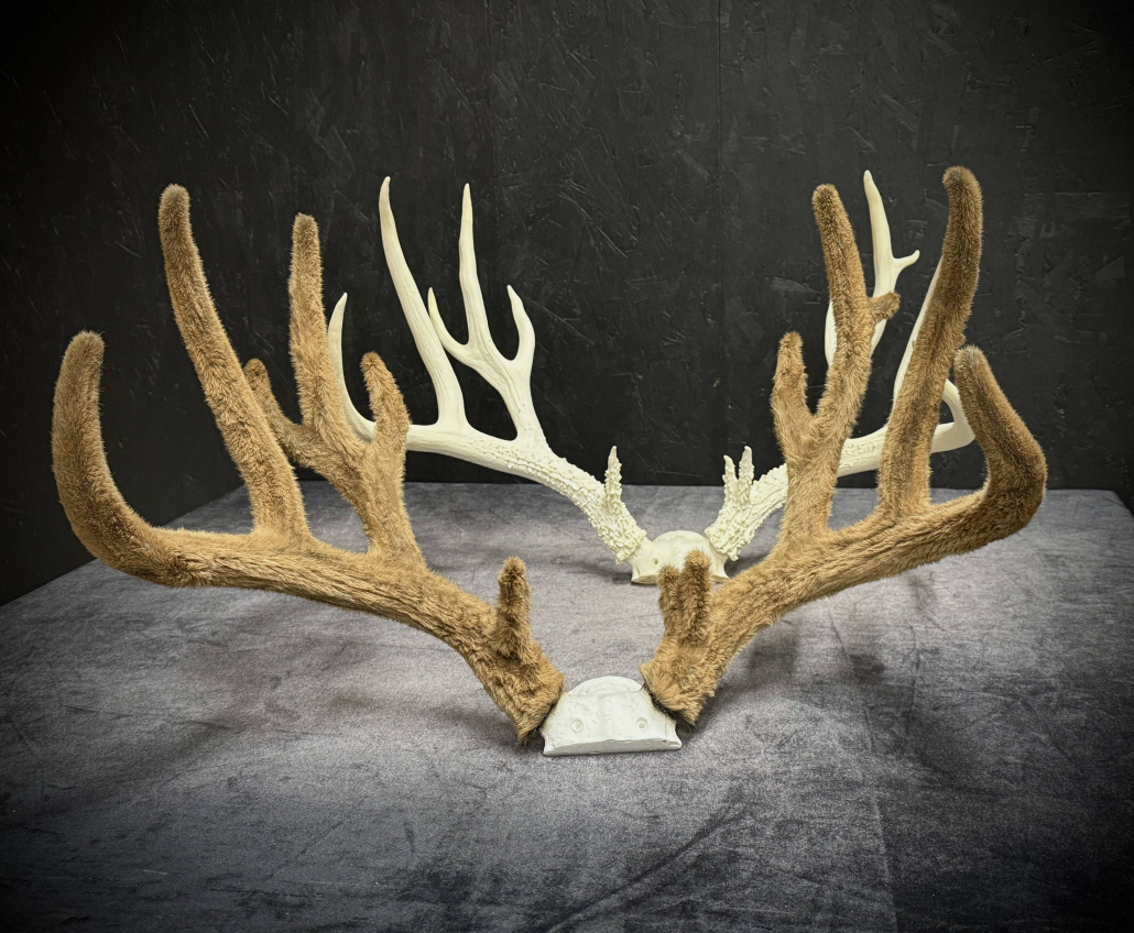 Beginning with fresh/frozen velvet antlers, the natural velvet is transferred to a replica set for total preservation of original size and ultimate durability. This creates an exceptional set of natural-velvet antlers as well as frees up the natural hard antlers.